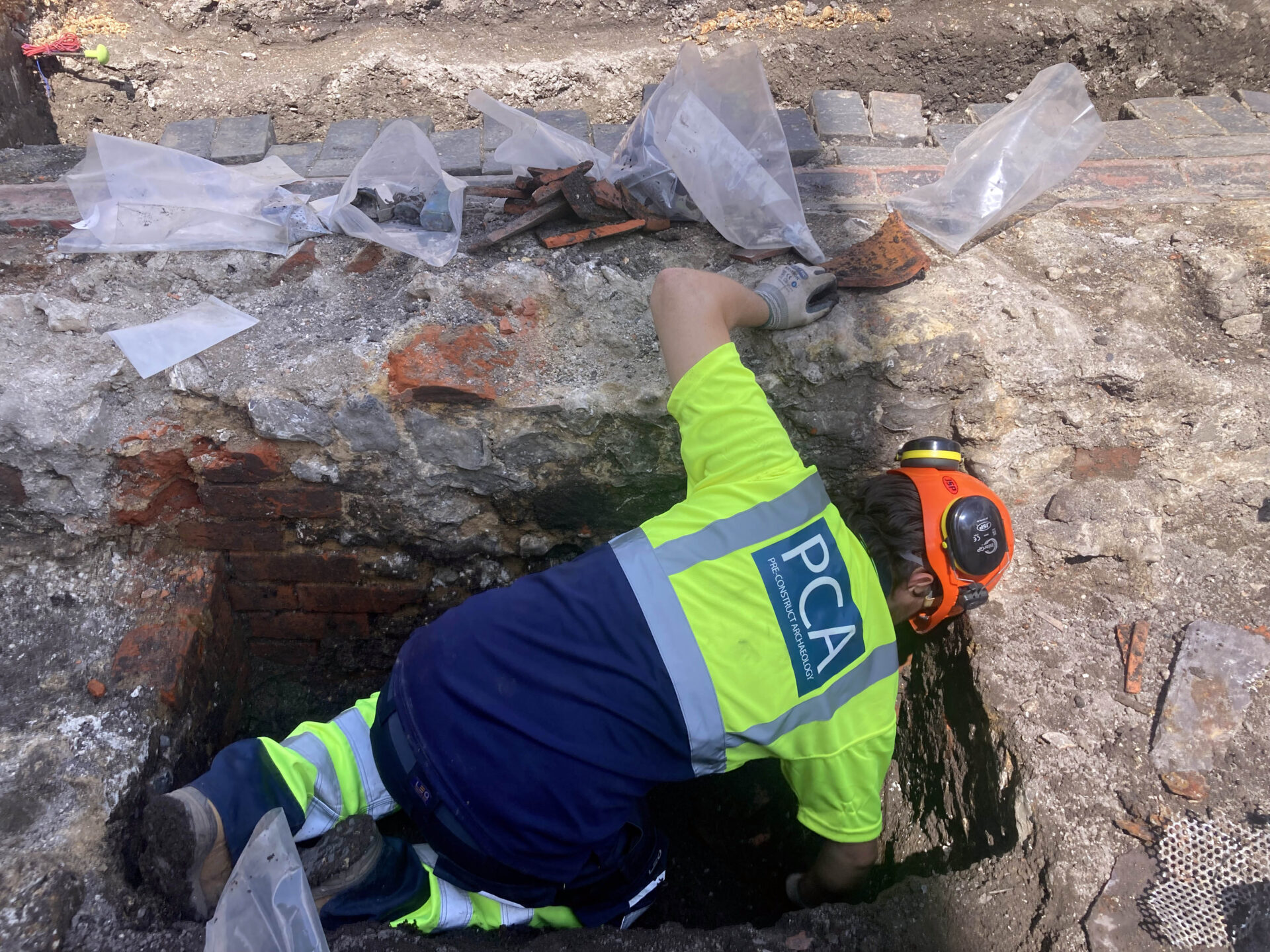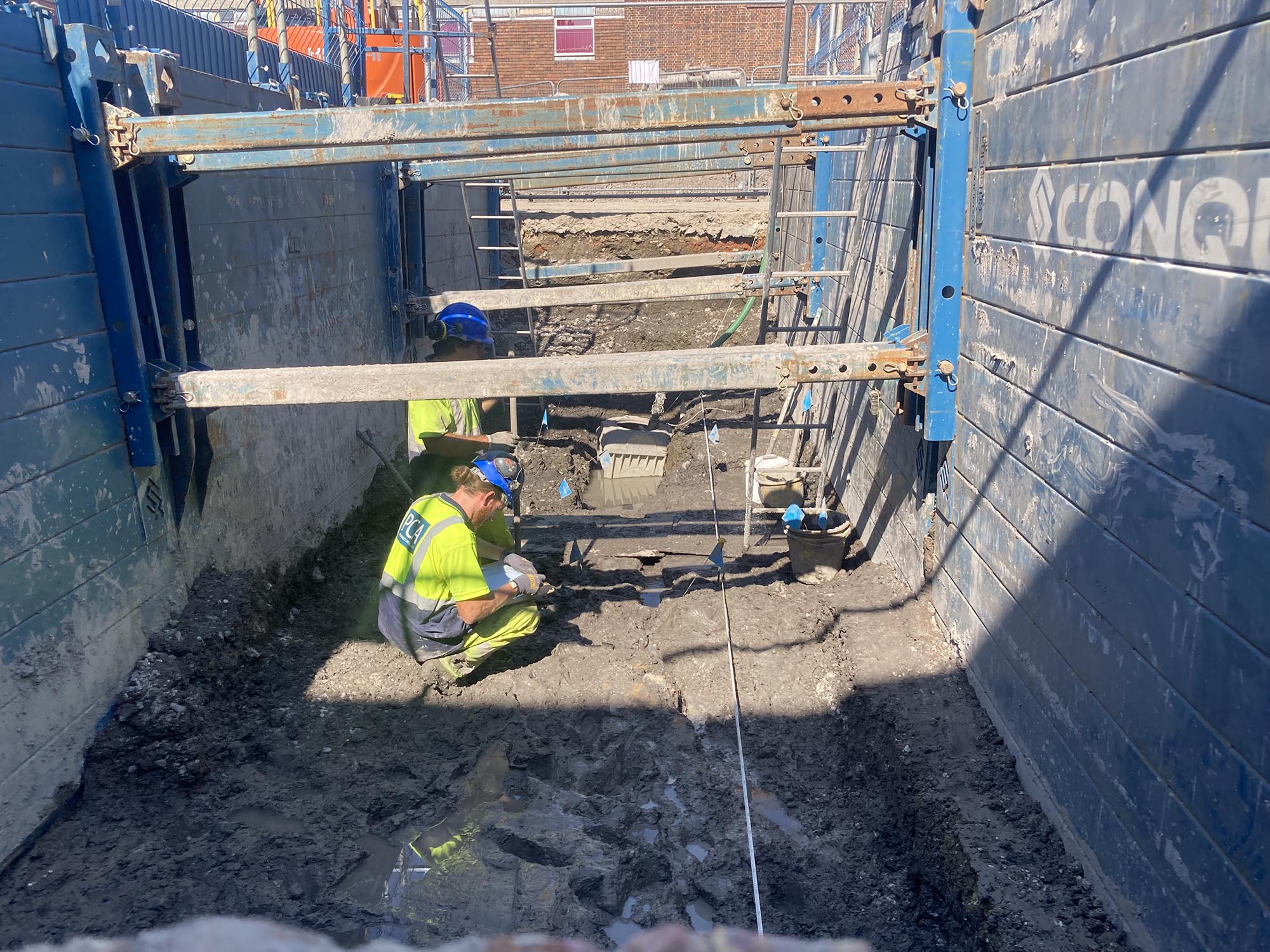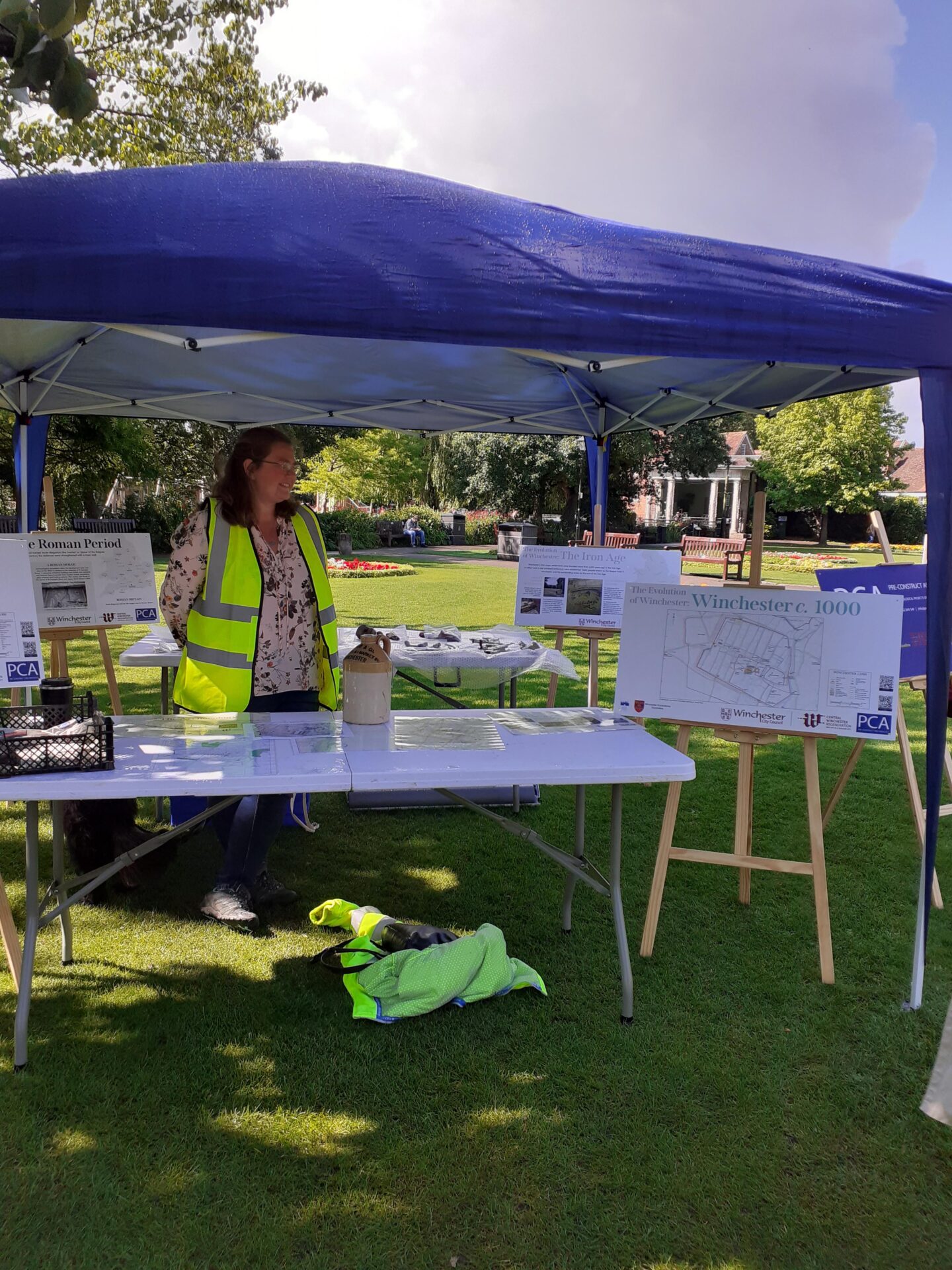 We had a fantastic turnout at our second open day at the Central Winchester Regeneration site. Visitors to the previous open day were eager to view our progress in Trench 1, and to see the dramatic, waterlogged Trench 3, which is now up-and-running with shoring and pumps. Our interactive activities in Abbey Gardens, such as the finds washing experience, were met with resounding enthusiasm, as evidenced by one young visitor who insisted, ‘No, Dad, I don’t want to go to the park; this is much better!’