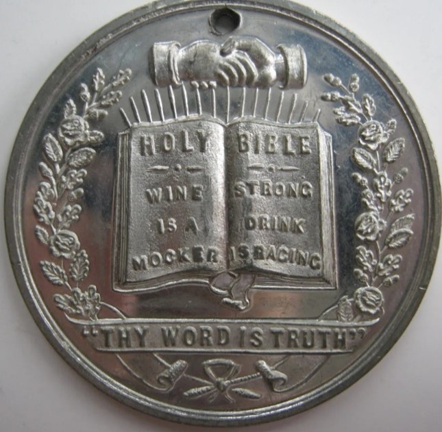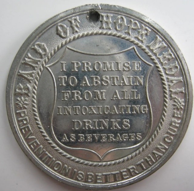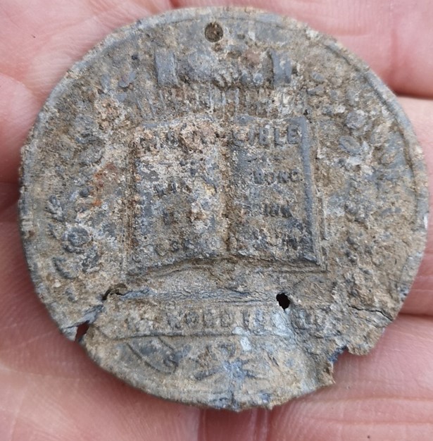 We recovered a white metal medal during recent investigations in Gloucester. These medals, 39mm in diameter, were awarded to those who took a pledge of abstinence from alcohol. On one side the medal reads “Band of Hope Medal – Prevention is Better than Cure – I Promise to Abstain from All Alcoholic Drinks as Beverages”. The reverse has an image of hands shaking and an open Bible with the words “Wine is a Mockery – Strong Drink is Raging – Thy Word is Truth.”