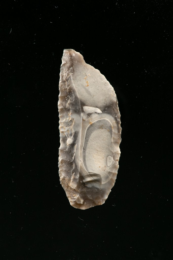 The ‘metal’ object turned out to be a very dense pebble of pyrite, a mineral named after the Greek ‘pyr’ meaning ‘fire’. The urn also contained a piece of struck flint – a plano-convex knife with semi-invasive retouch around all edges. These types of implement were frequently used as grave goods during the Early Bronze Age, this one having been placed after the cremation process with the deceased’s ashes by the mourners. They seem to be quite personal objects and may even acted as a kind of insignia or token of their identity – interestingly this one doesn’t seem to have been used very much and may even have been made specially for the funeral. It is particularly impressive as it seems to have incorporated, or been crafted around, the oval inclusion in the middle which makes it even more striking!
