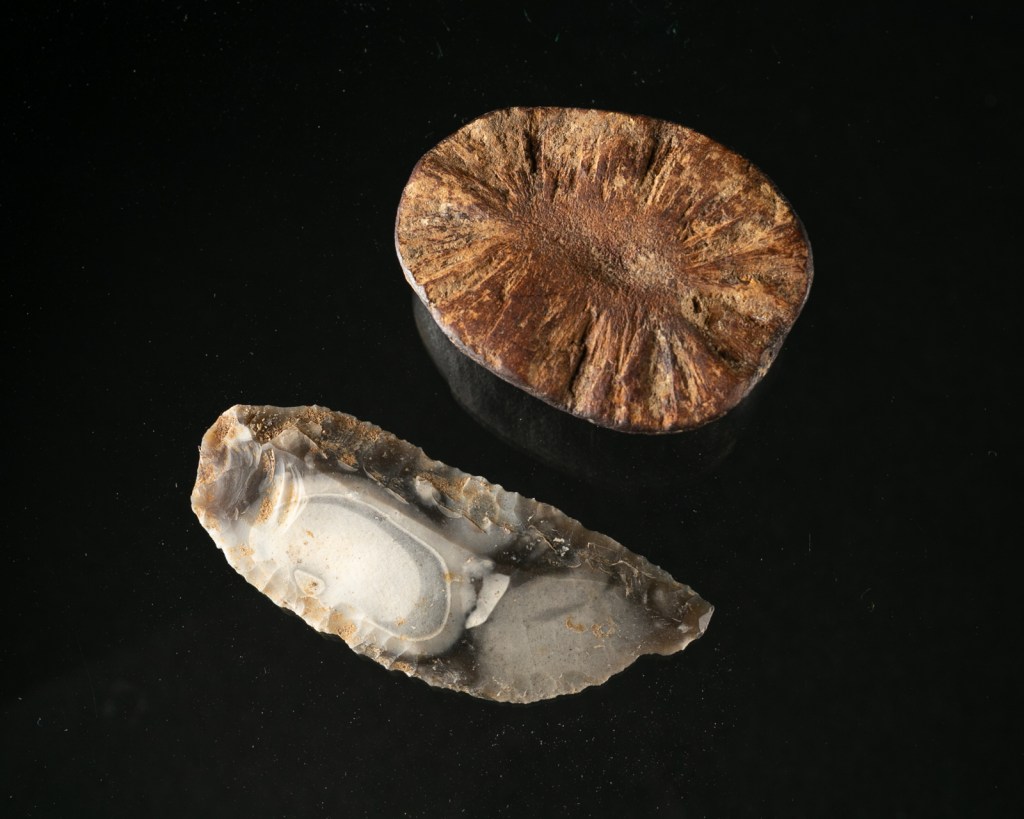 Together these two items raise the exciting and fascinating possibility that they could form part of a strike-a-light, or ‘fire-kit’, attested to in prehistoric mortuary contexts throughout Britain. There is the suggestion of a use-notch on one end of the stone and the rough split edge would produce sparks when struck the flint; these types of knives are known to have been used to make fire in this way.