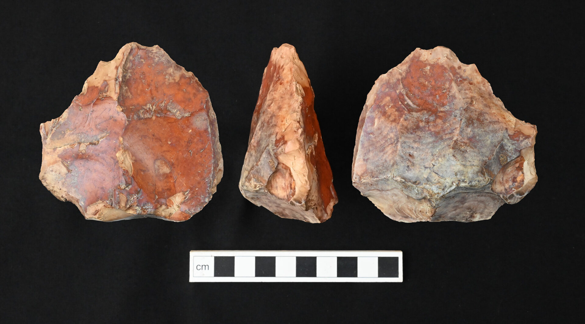 This battered but fascinating find is a heavily rolled and mineral-stained biface, probably a handaxe, dating back to the Lower-Middle Palaeolithic period. It measures 87mm long, 82mm wide, and 44mm thick, and is of lenticular/cordiform shape. One side displays centripetal working with opposed removals on the other. Its well-worn condition indicates long periods spent within active burial environments, such as glacial tills or river terrace deposits. The natural deposits beneath the site are Lowestoft Formation glacial till, dated to the Anglian glaciation, around 400,00–500,00 years ago. Though its exact origin isn’t certain, if it’s from these glacial tills its rolled state indicates that it pre-dates them, making it an exceptionally old and rare discovery. However, as it was found close to the surface, such an attribution is far from certain. No other Palaeolithic artefacts have been recorded in the vicinity.