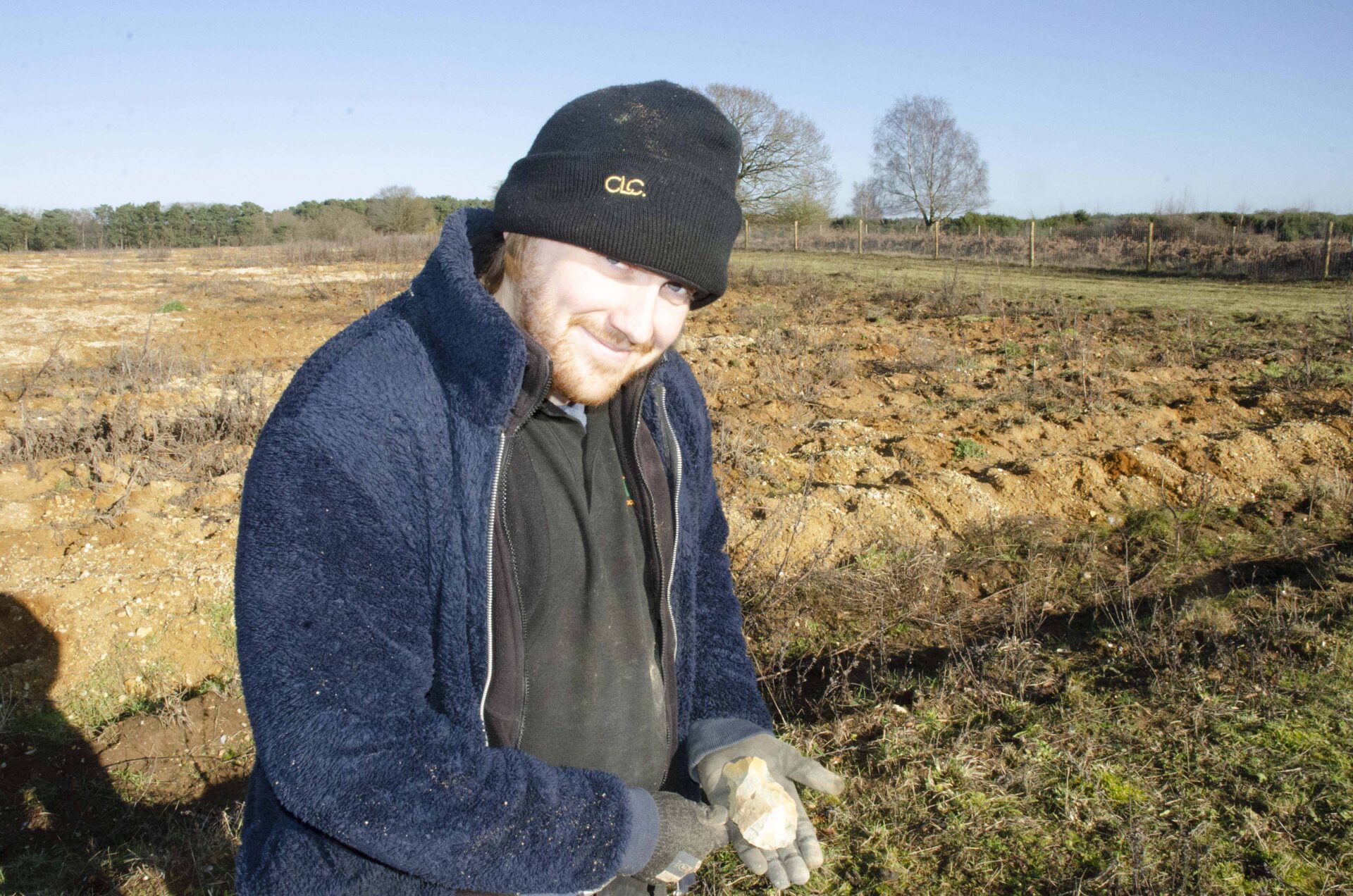 Pre-Construct Archaeology was commissioned by Jacobs UK Ltd on behalf of Highways England to undertake a programme of targeted archaeological investigation, metal detecting survey and field walking following removal of a Forestry Commission plantation at the proposed development at Hockwold Heath, Norfolk. The 50.4 ha scheme comprises a habitat compensation area to be provided for stone curlews to mitigate habitat lost from the construction and operation of the A11 Fiveways to Thetford scheme.