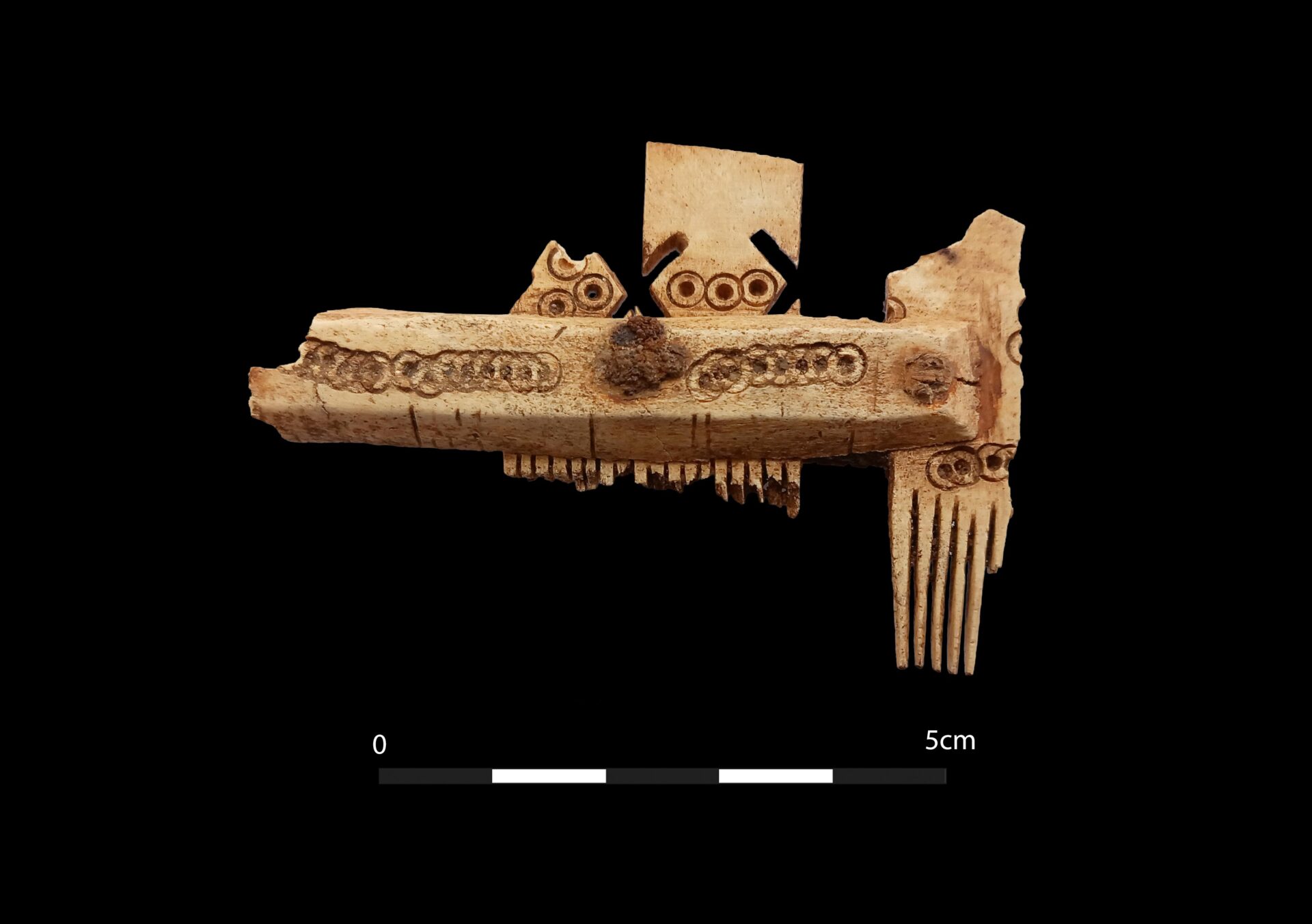 The comb’s trapezoidal connecting plates, along with its elaborate decoration (sawn-out openwork X designs and undulating chains of overlapping ring-and-dot) match Mairéad Dunlevy’s class C2 Irish combs, dated to the 7th–early 8th centuries.