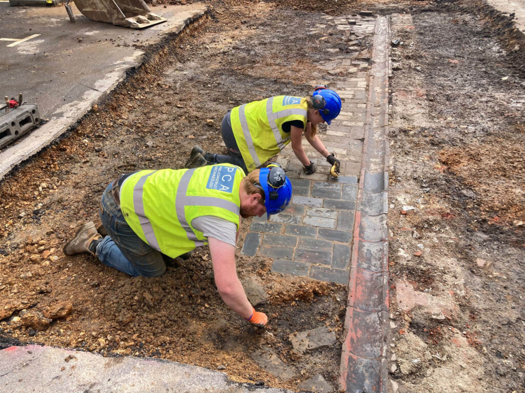 The Central Winchester Regeneration site has come alive! Work began on Monday 17th July with excavation in the car park next to St Clement’s surgery on Tanner Street. The site has been buzzing with the arrival of fencing and equipment, including the ‘Big Orange Trowel’. A start has been made on Trench 1 next to Coitbury House, with the asphalt and modern layers removed under the watchful eye of Shane Maher.
