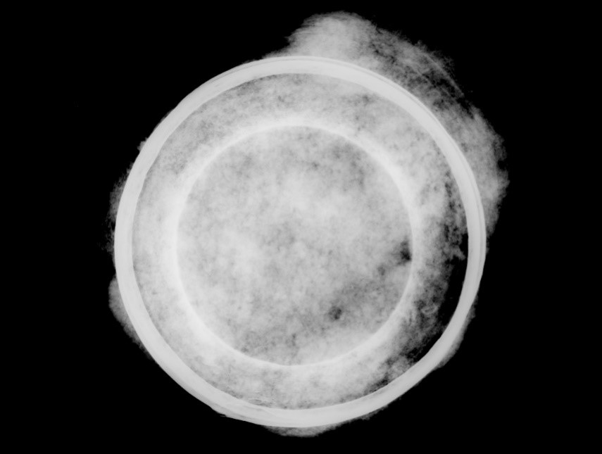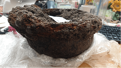 A horizon of dark earth covering the site suggests a suburban area on the edge of the Roman town, primarily used for intensive ‘market garden’ cultivation. This deposit contained copious quantities of Roman hearth waste and midden material, as well as an abundance of Roman pottery, metalwork and 3rd– to 4th-century coins. Other finds include remains of gravel yard surfaces and a group of four c. 3rd-century inhumation burials. A very well-preserved iron cooking pot was recovered from one Roman rubbish pit, seen here with X-rays of the metal vessel before micro-excavation.