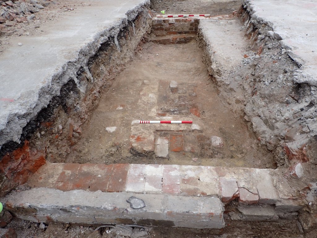 Over the course of five days, we opened three evaluation trenches, two in the current car park to the east of the yard and one in the fire station yard itself. In the car park, Trench 1 revealed the brick-built vestiges of the old shop frontages (below), which one fireman recognized as a former bakery upon whose first floor his mother had been born! The northern end had seen damage by later 20th century building but an old fireplace could be discerned whose hearth was still scorched from numerous hearth fires.