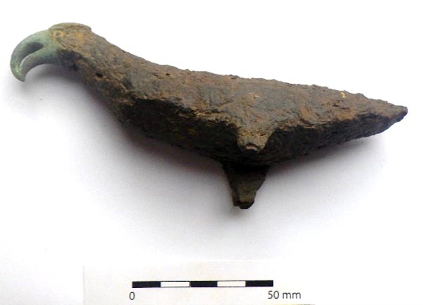 The Darlington Eagle – An iron eagle with a copper alloy head. The head is similar to the bronze Silchester Eagle. The x-ray shows that the copper alloy head is on a stem which goes into the iron body. On cleaning there is a small patch of green enamel surviving in one eye. The legs are damaged and there is no good join to the lamp holder but the width between the legs suggests that this object was mounted on it.