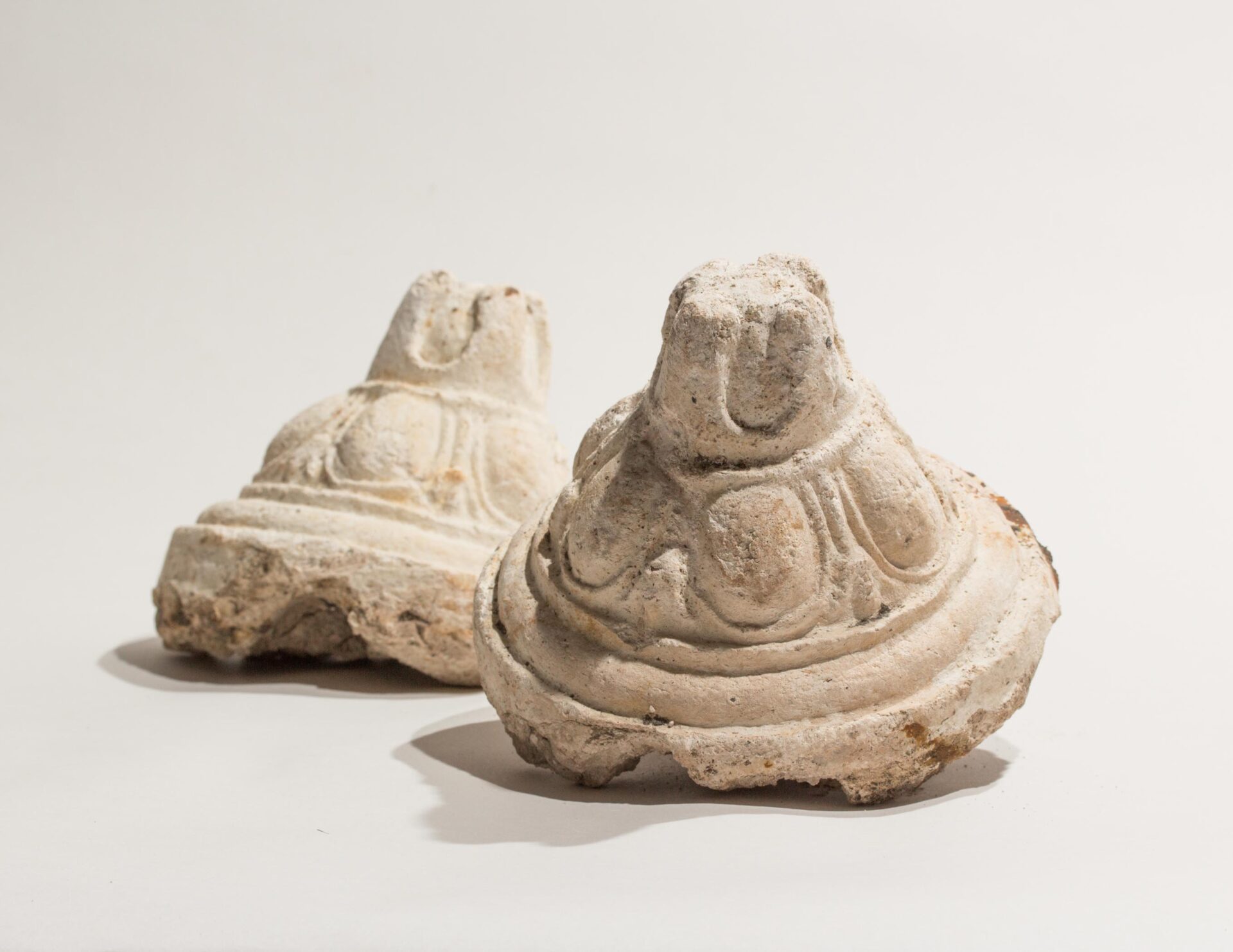 A substantial quantity of decorative plaster was recovered from the backfill of a late medieval chalk lined well (below). Three repeated moulded elements were present including bosses, with what appears to be egg-and-dart detailing, acanthus leaves and deep moulded ribs, all probably from a single collapsed or demolished ceiling. It is difficult to determine how each of the fragmentary elements relate to one another, although they probably take the form of some form of geometrical pattern or ‘fretwork’. Ornate plasterwork emerged as the dominant form of ceiling decoration in the Elizabethan and Jacobean period, with the combination of enriched ribs, motifs from moulds, pendants and bosses becoming particularly fashionable during the early 17th century. The egg-and-dart motif is a classical revival, popularised by Inigo Jones in his less elaborate schemes post-dating c. 1620, although it was probably present in earlier pattern books and thus could be earlier.