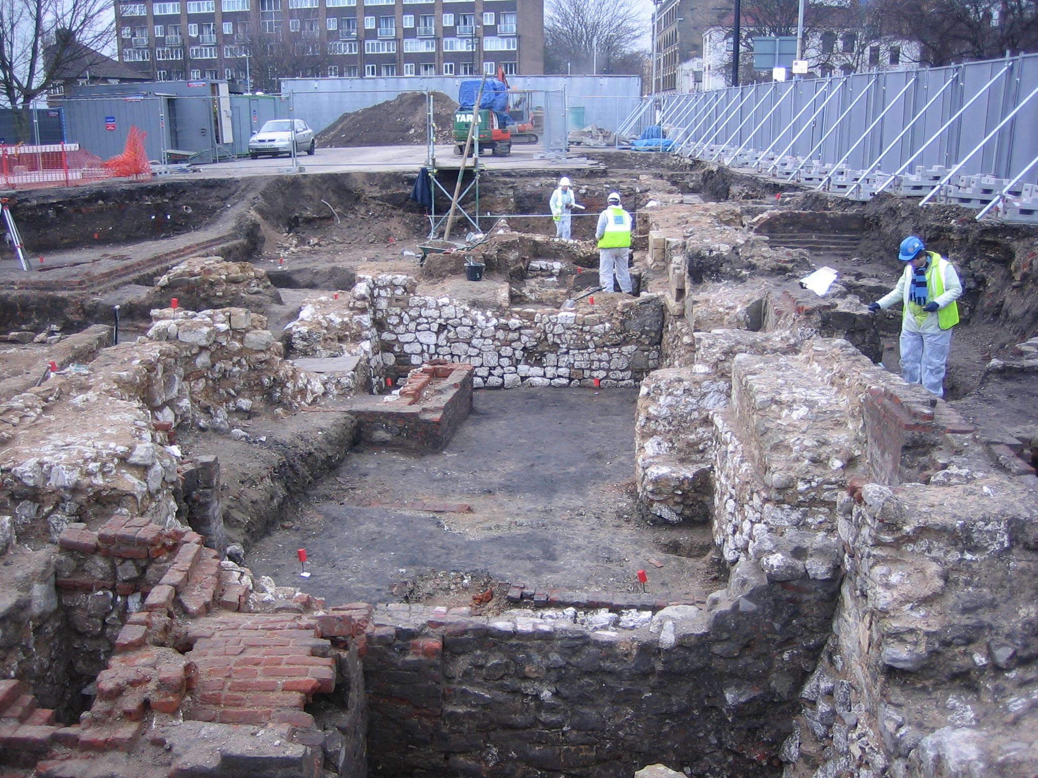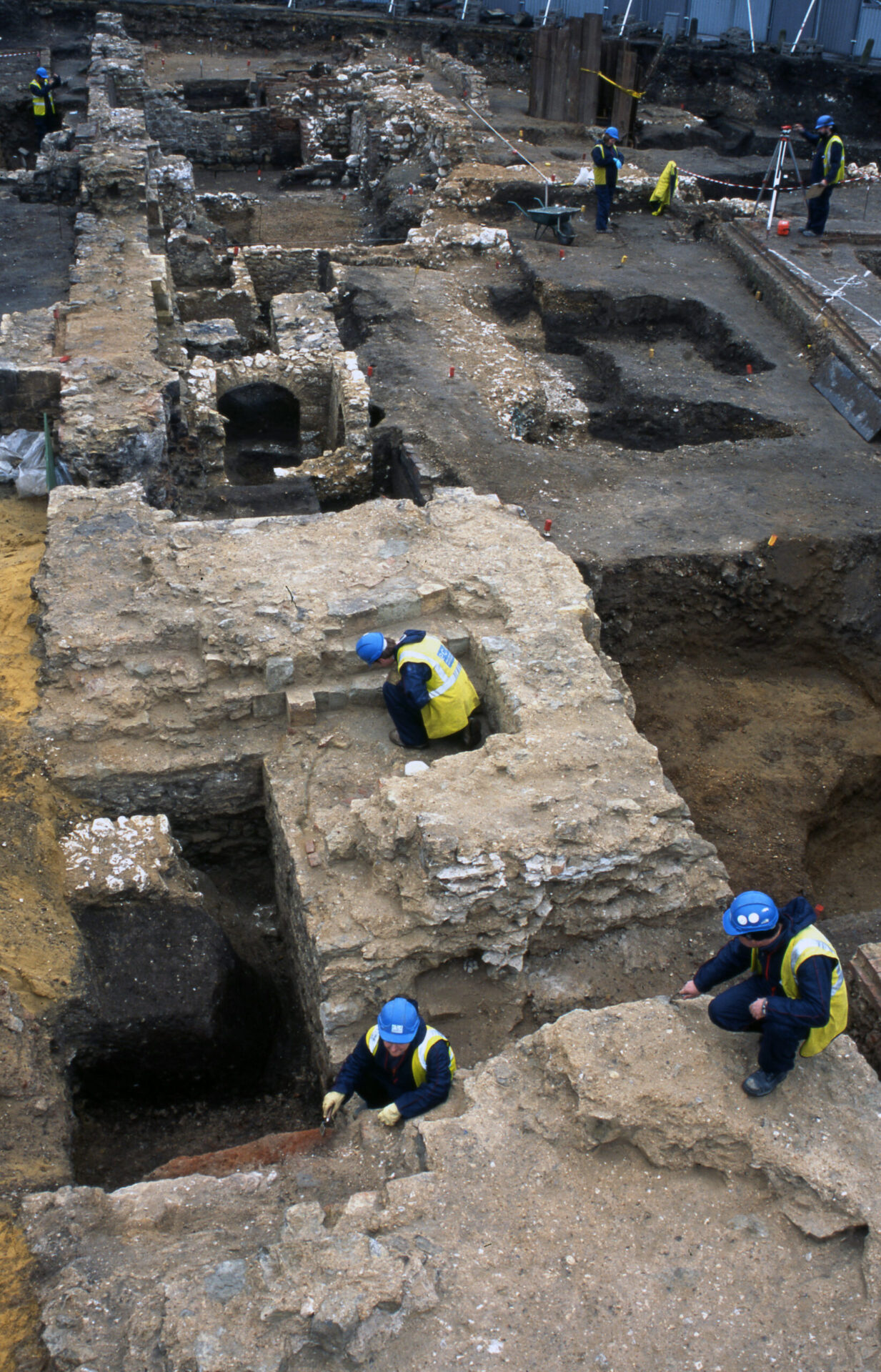 View of excavations at Bermondsey: in the foreground, the south flanking tower at the western entrance to the abbey church; behind this, the arched structure is a late medieval well. The kitchen basement of the 16th-century ‘mansion’ built by Sir Thomas Pope, the founder of Trinity College, Oxford, is visible in the background.