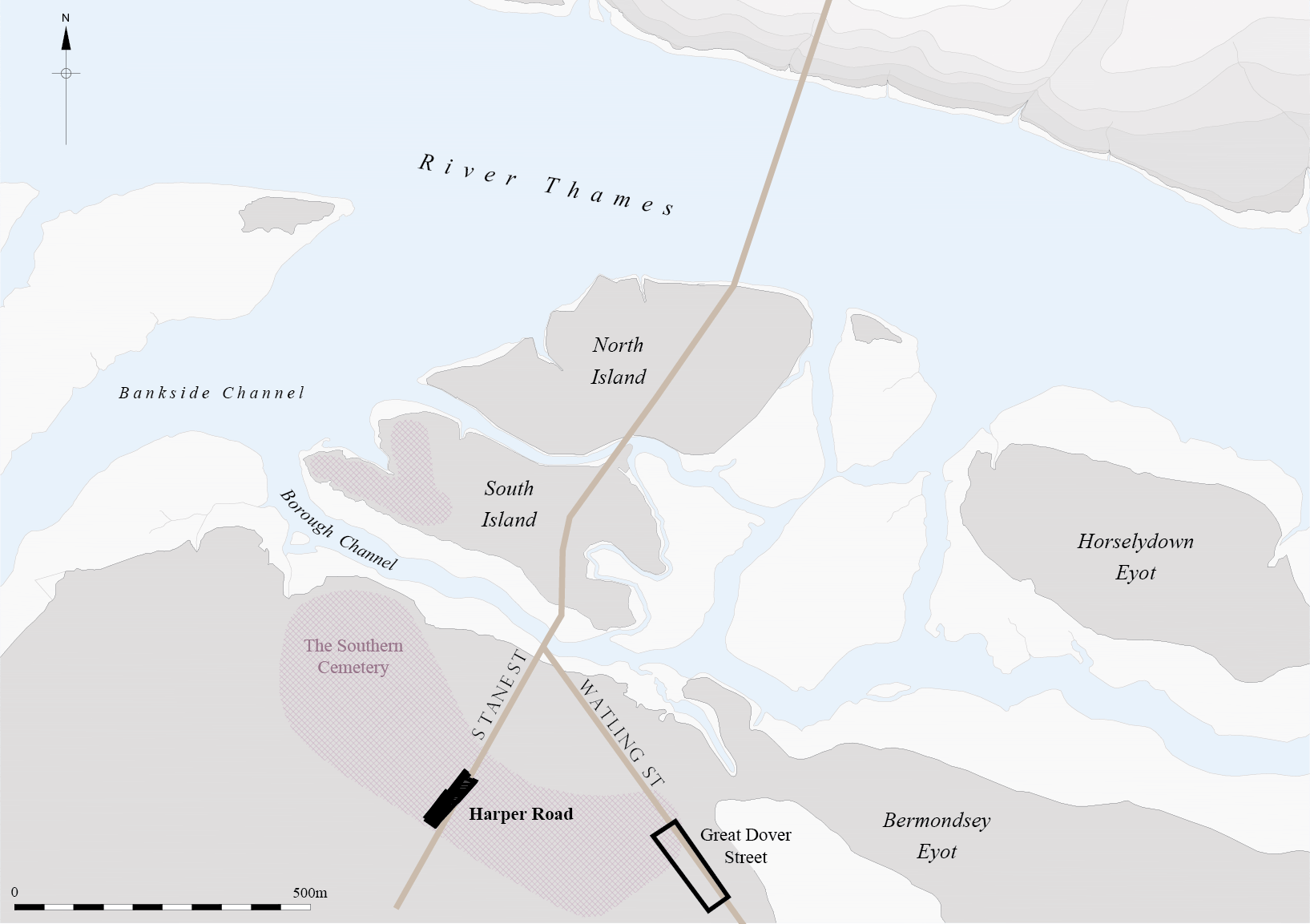 The archaeological evidence for Roman road infrastructure to the north of Southwark’s Borough Channel have been recorded since the 1970s and discussed in detail during the course of the last 14 years. To the south of the channel, evidence for Watling Street has been found along its approach into London and in particular Southwark, where a substantial segment of it was excavated at Great Dover Street. However, before the Harper Road excavation, there was no direct, conclusive evidence for Stane Street in Southwark. A low-lying marshy area known as the Rockingham Street Anomaly had raised the possibility that Stane Street may have followed a course similar to that represented by Borough High Street to avoid this marshy terrain.